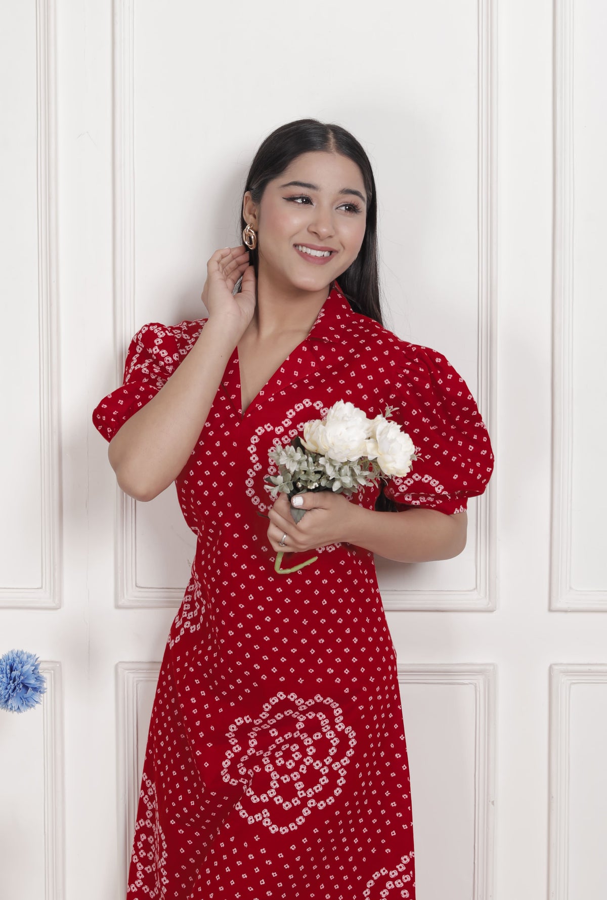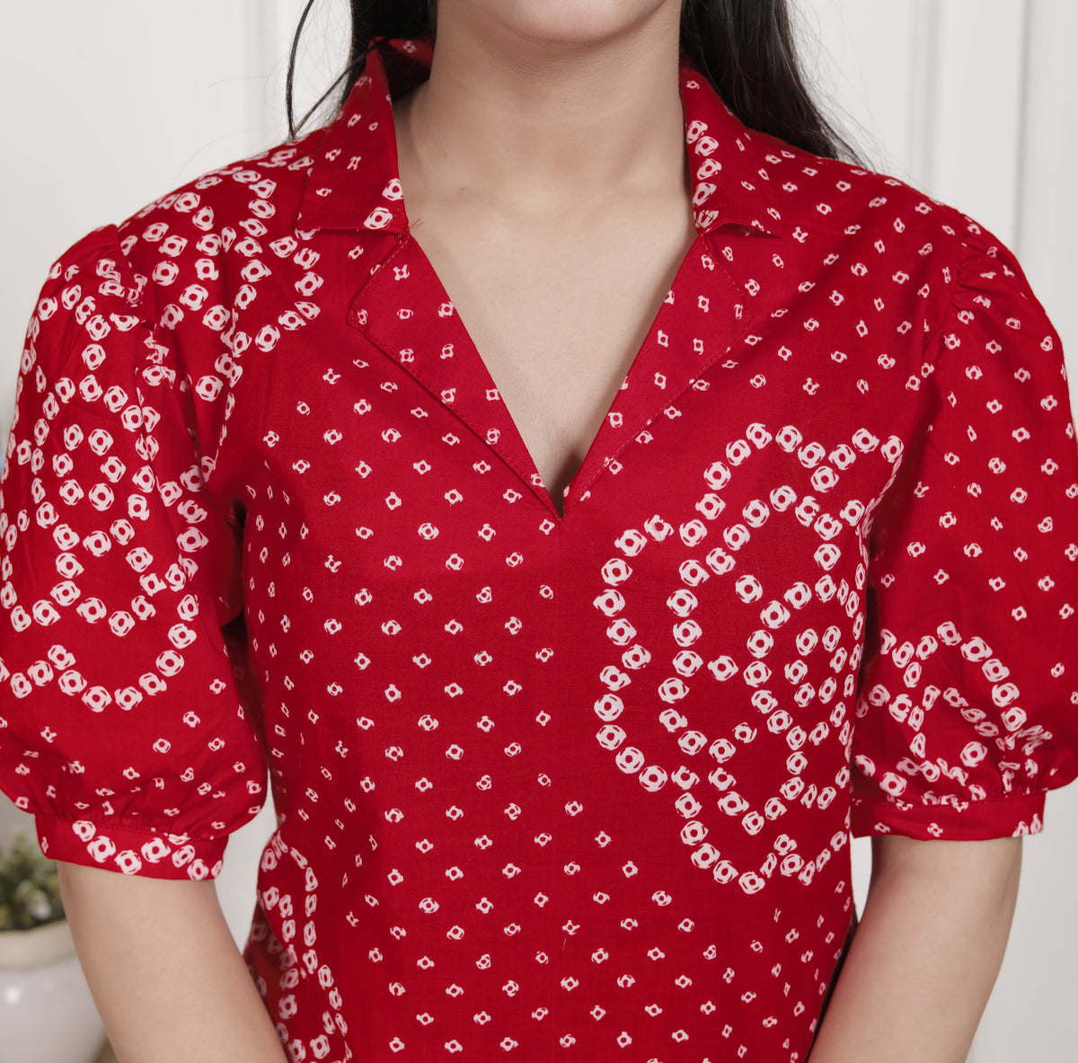 Red Bandhani Printed Cotton Maxi Dress with Collar Neck – Vacation Wear