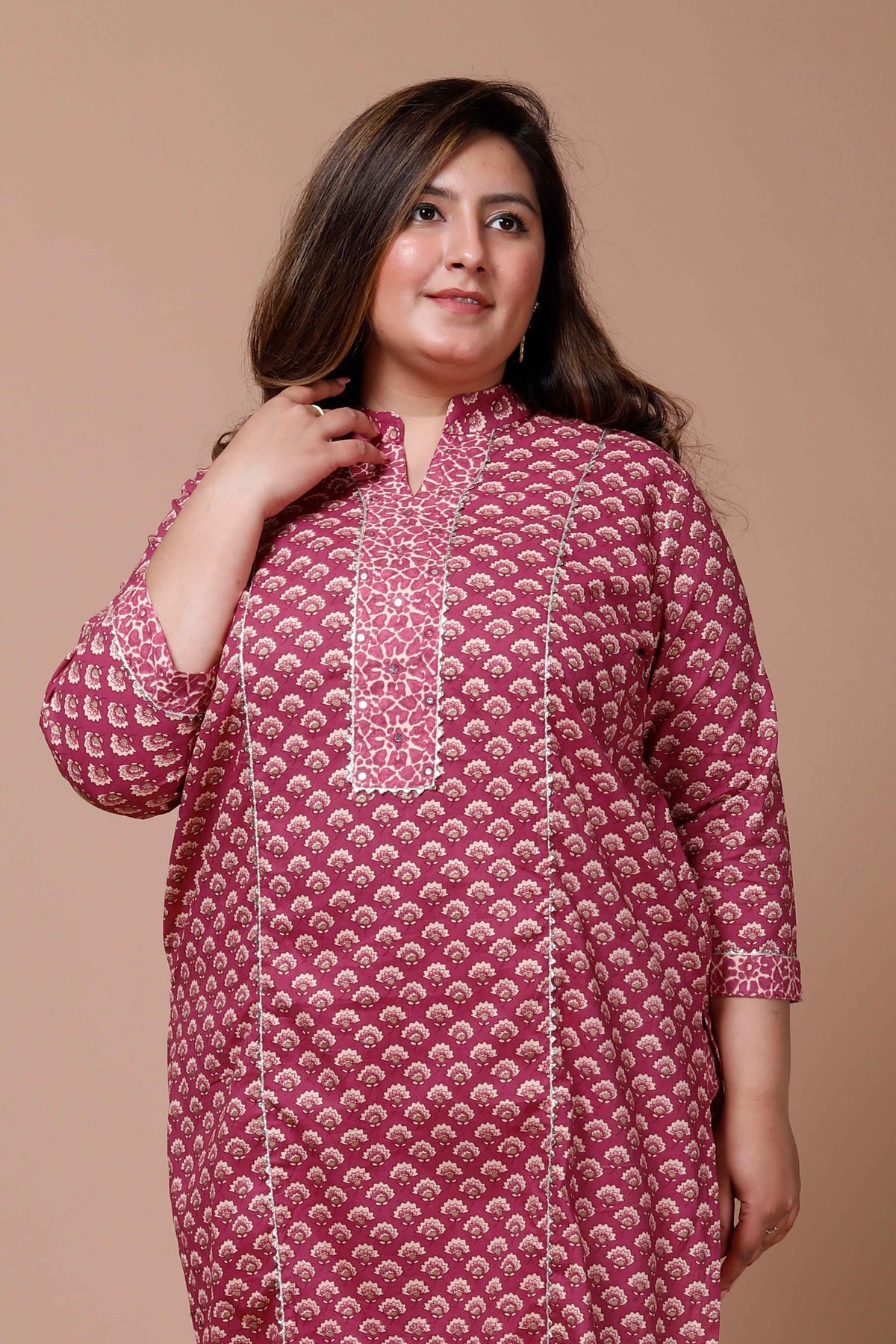 Floral Printed Pink Cotton Straight Kurta with Palazzo Set - Pink / S