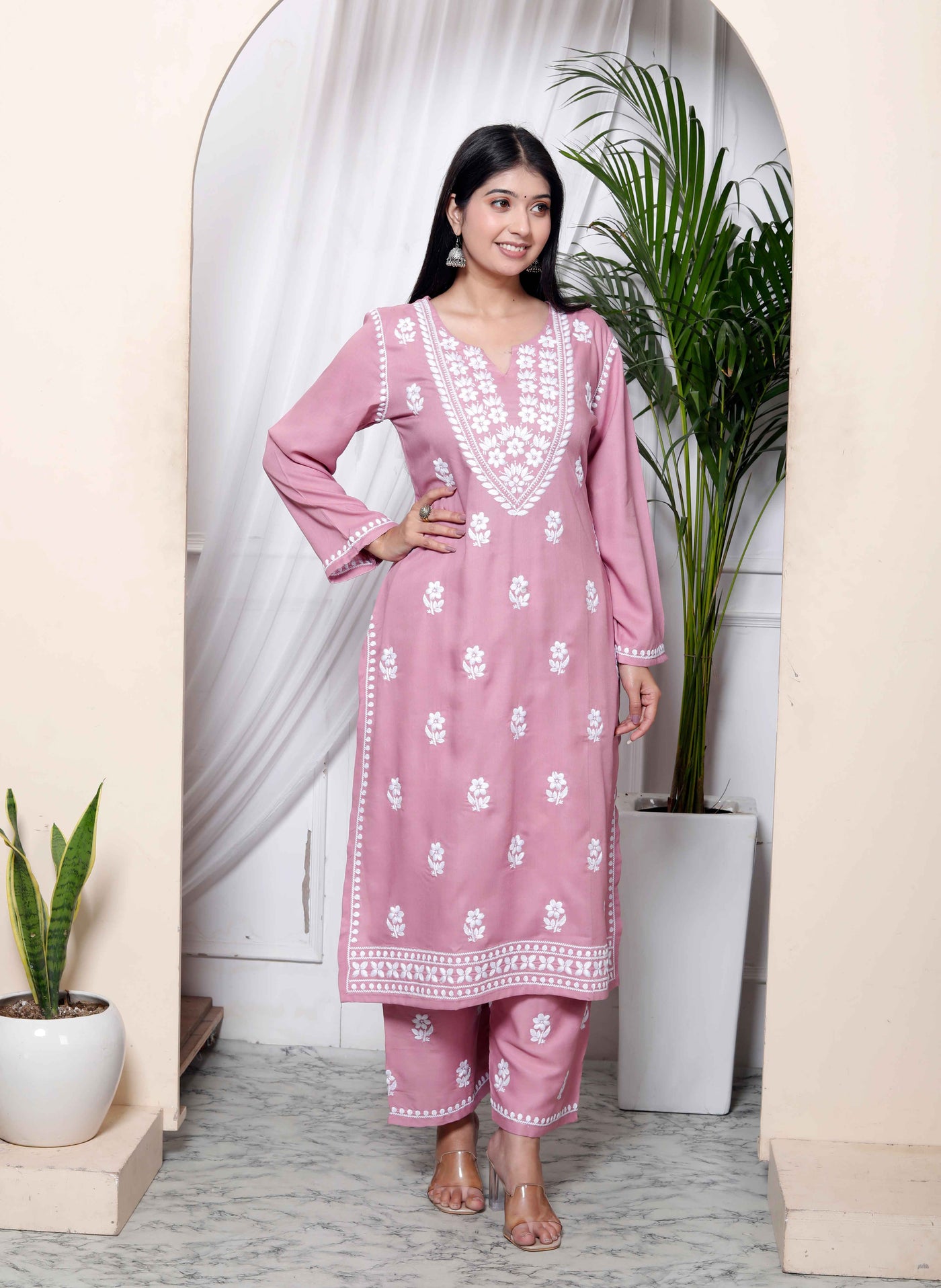 Pink Chikankari Embroidered Straight Kurta with Palazzo Set