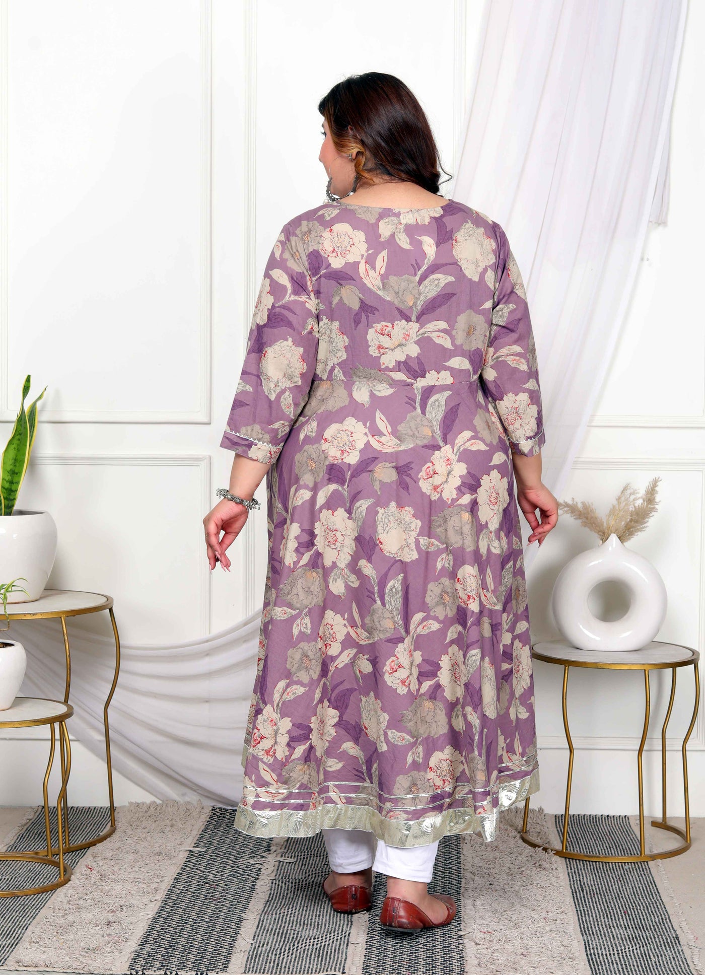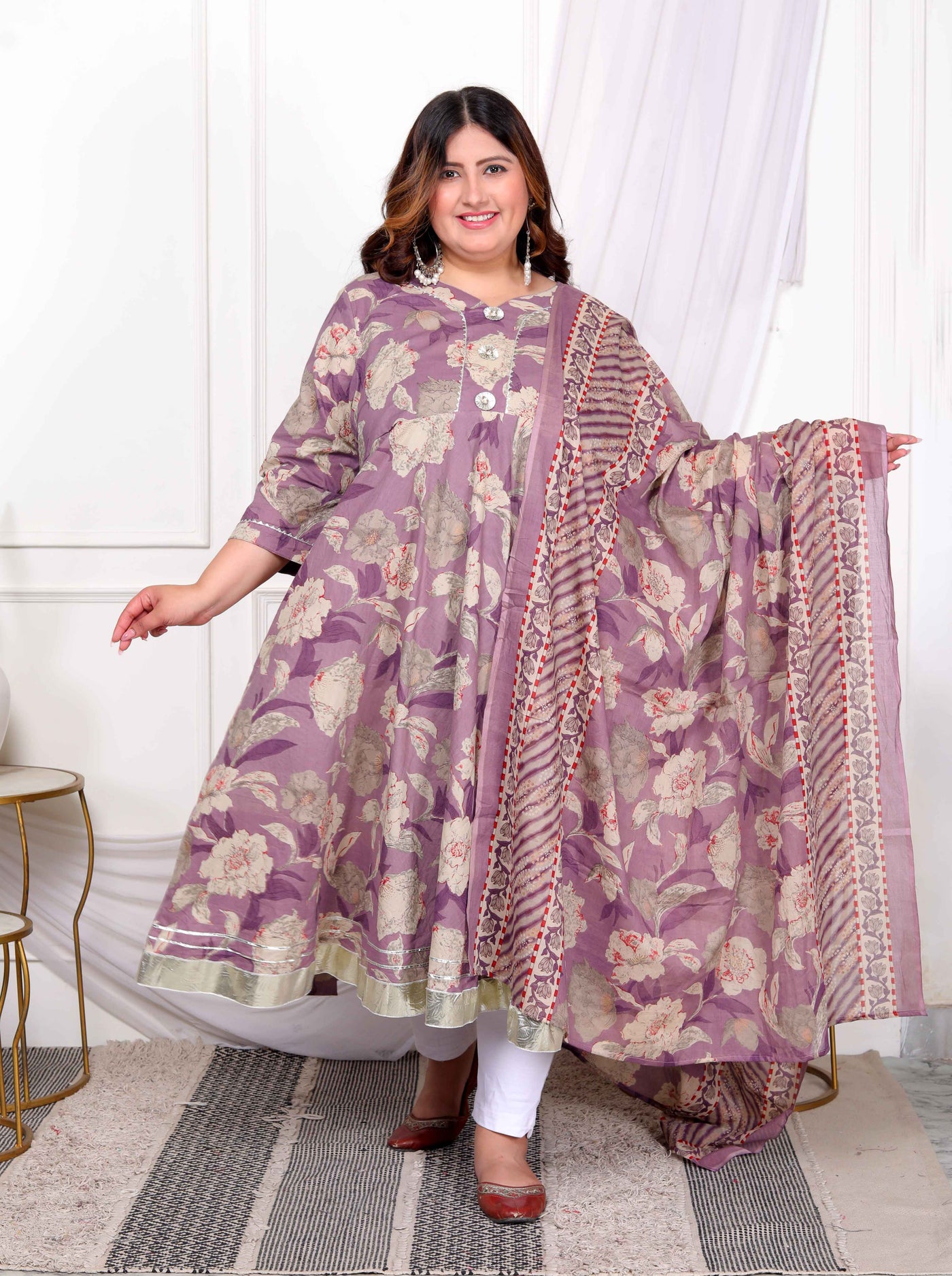 Purple Floral Gota Lace Cotton Anarkali Kurta with Dupatta Set