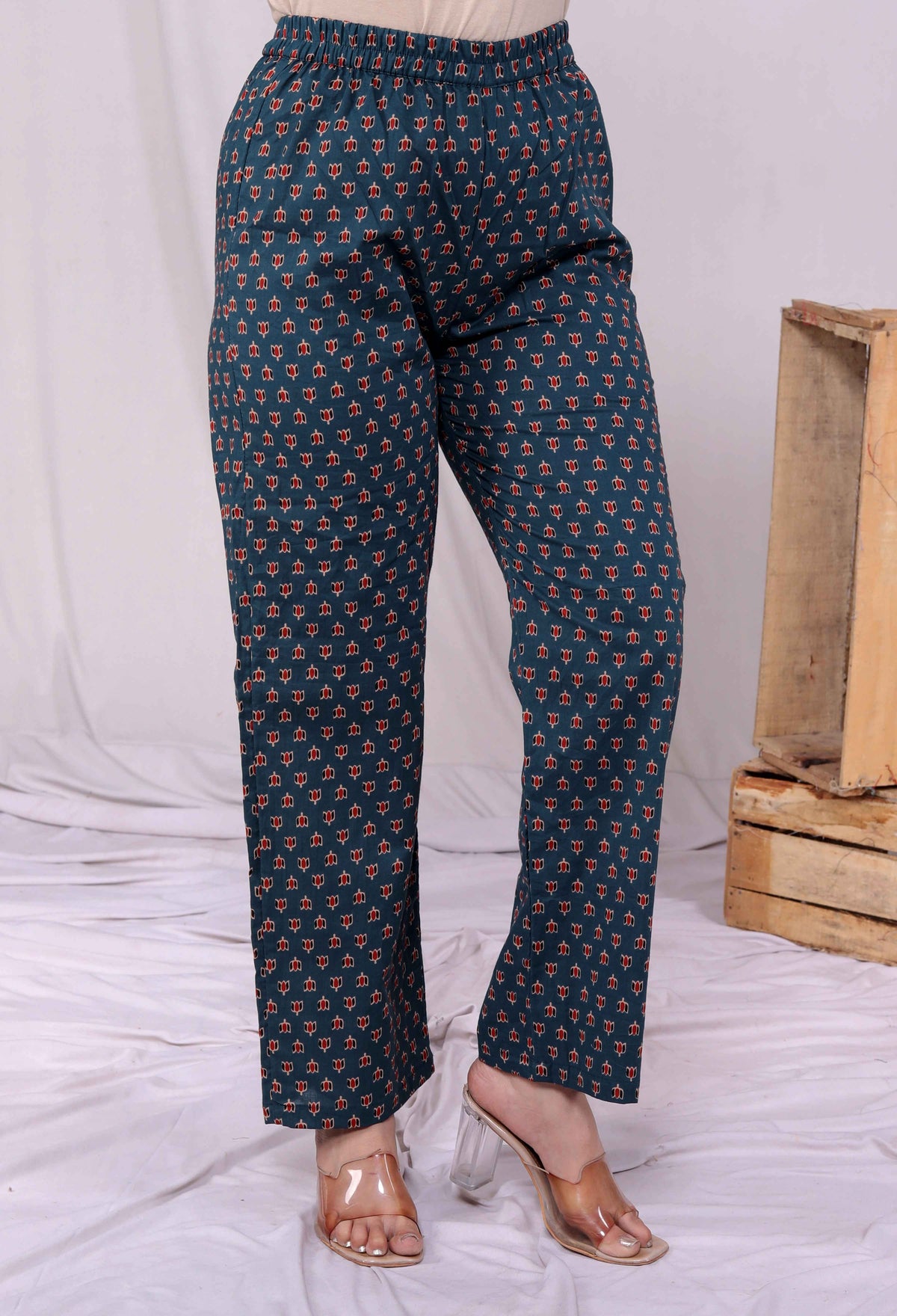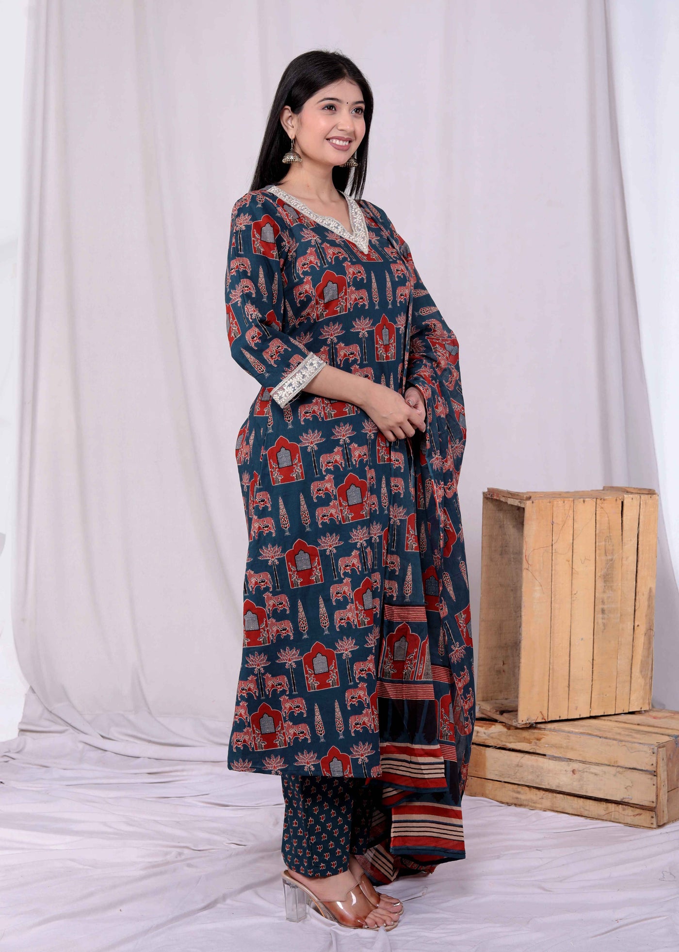 Blue Cotton Animal Print Kurta with Palazzo and Dupatta Set