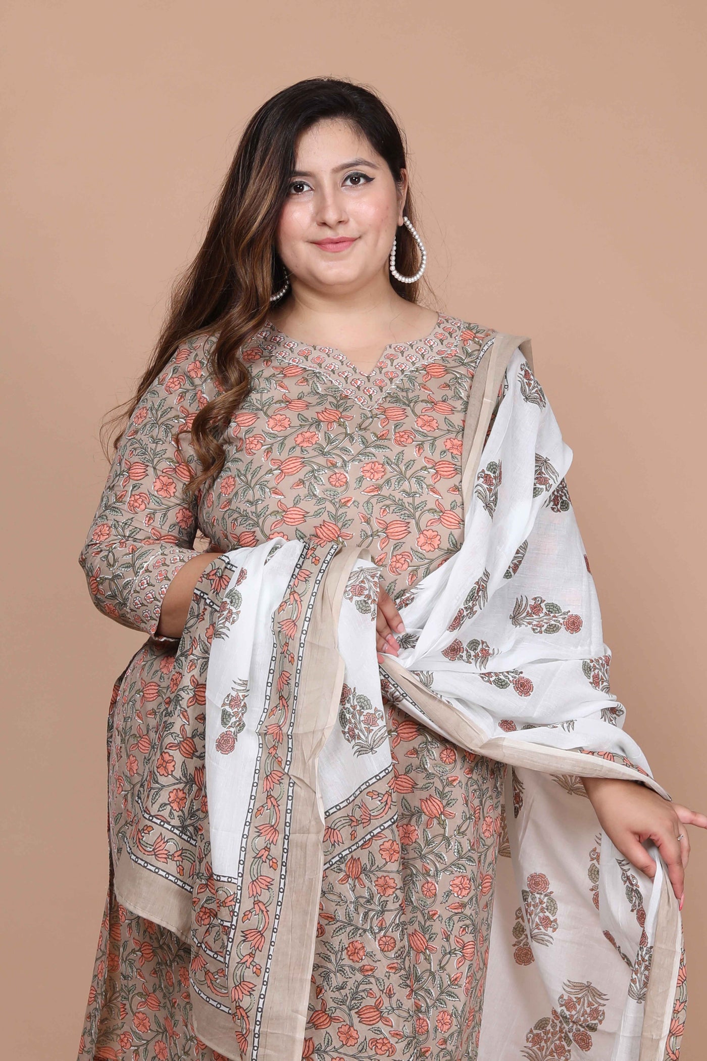 Brown Printed Pure Cotton Straight Kurta with Palazzo and Dupatta Set - Brown / S