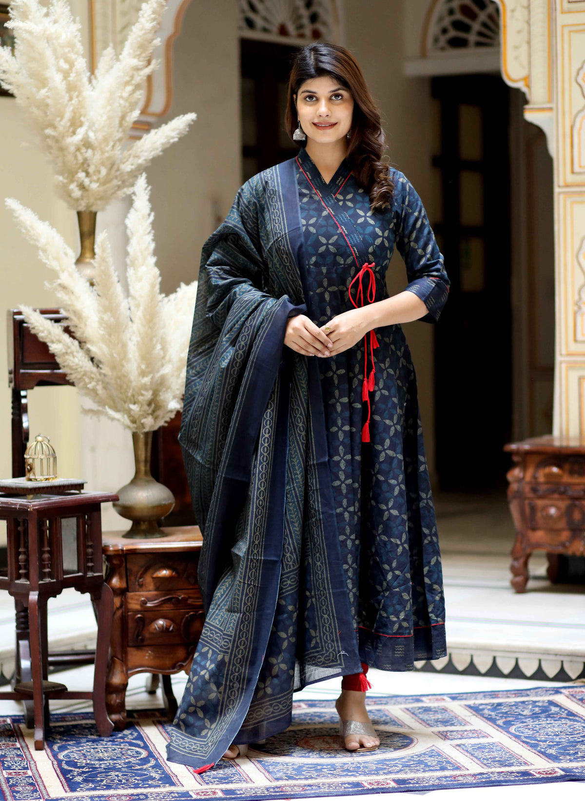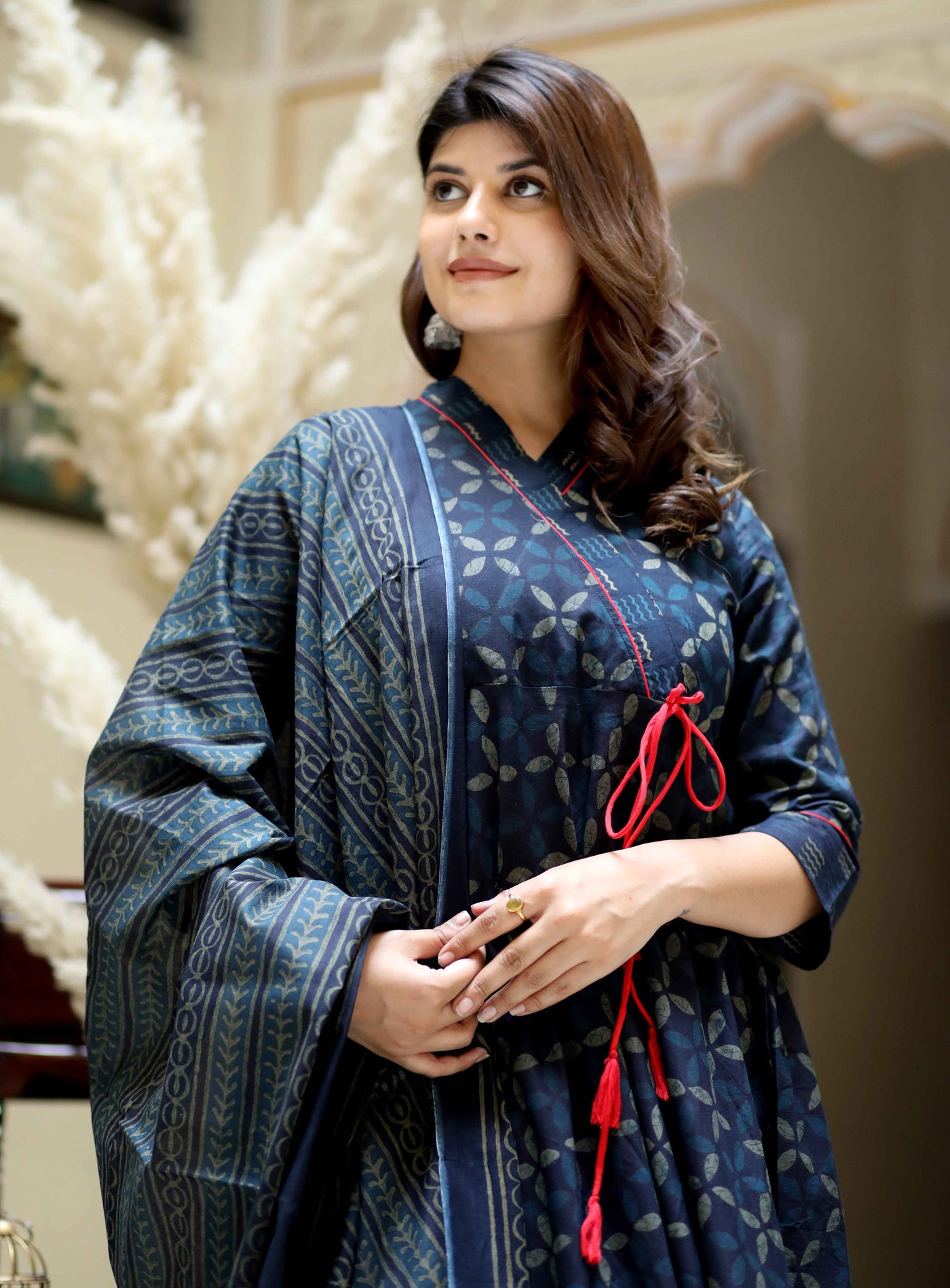 Blue Abstract Cotton Angrakha Kurta with Tassel Dupatta Set