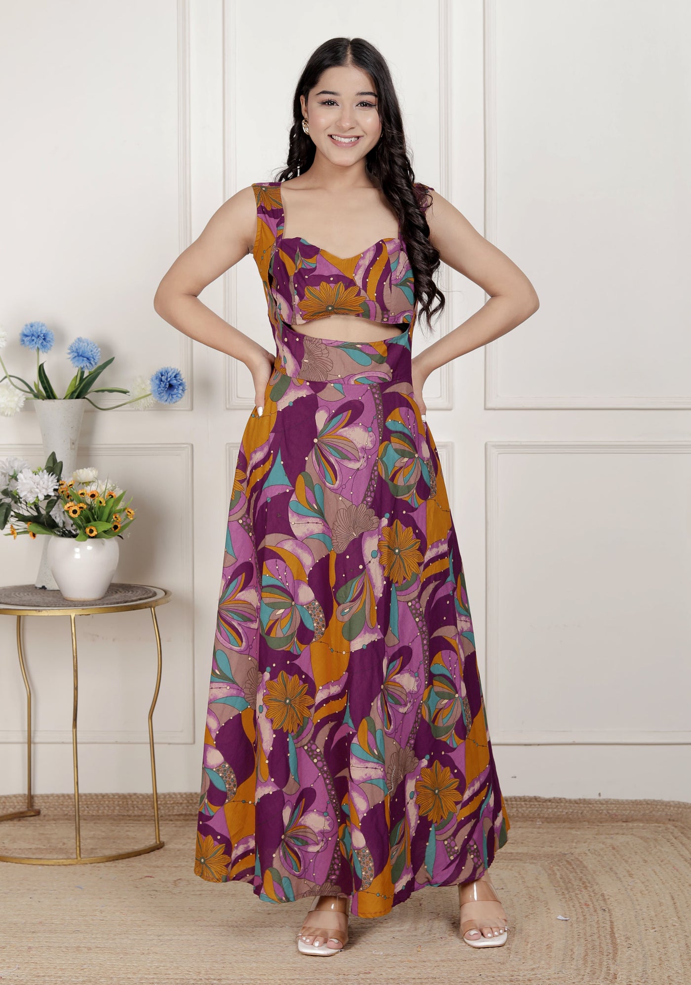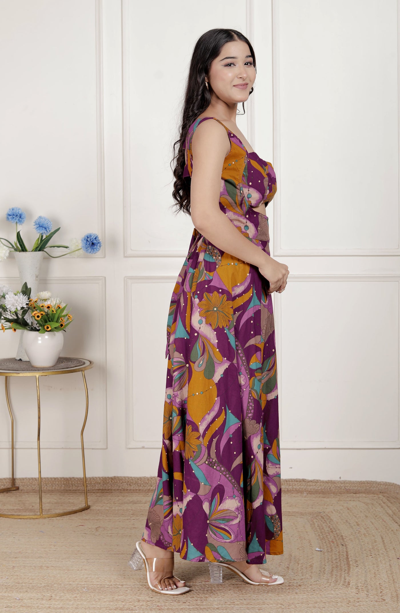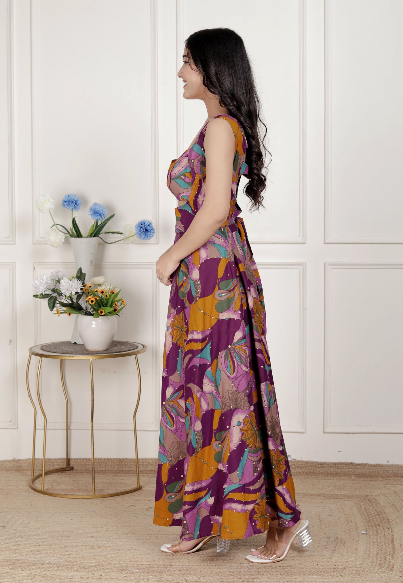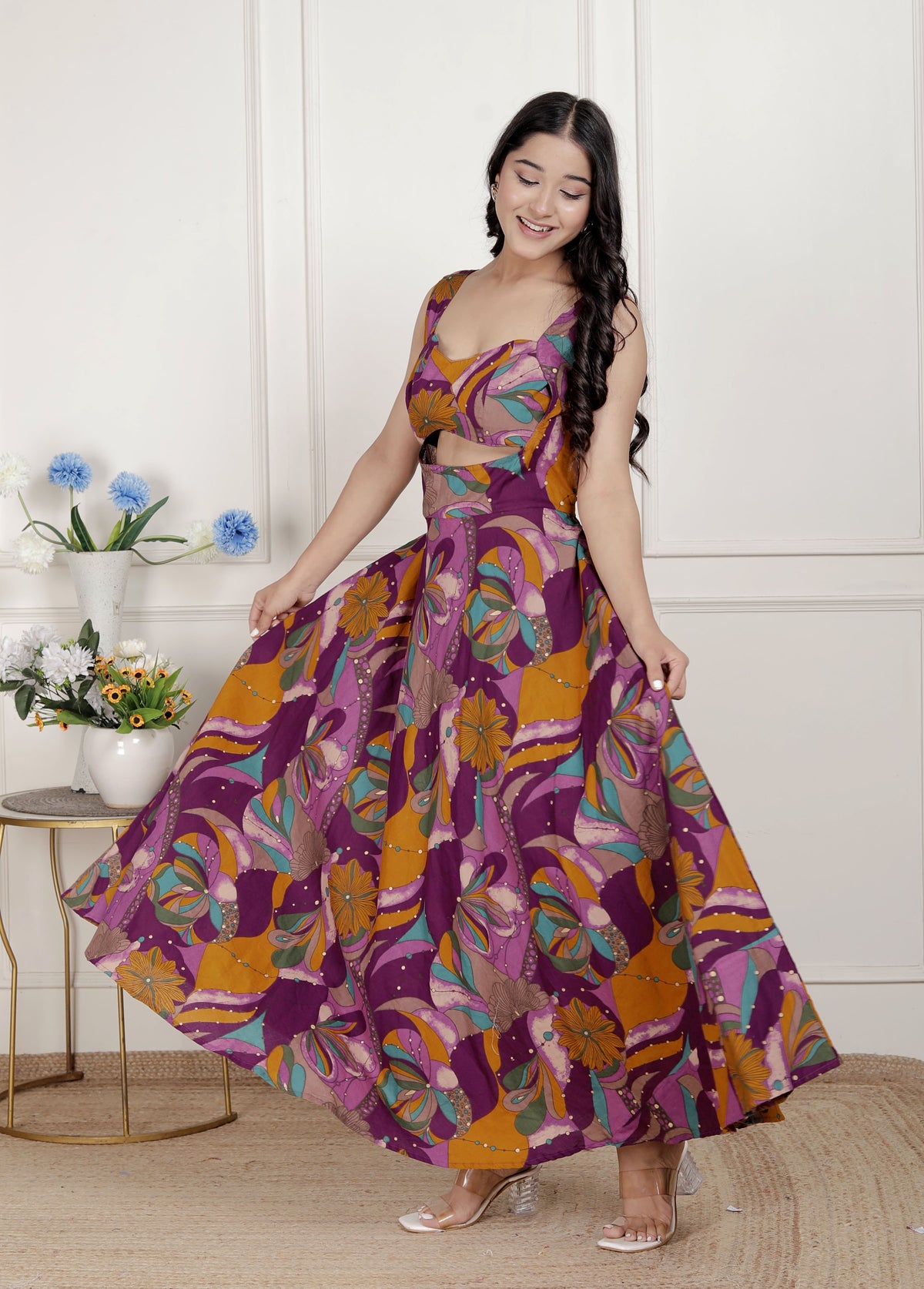 Magenta Floral Cotton Sleeveless Western Dress with Cut-Out Detail